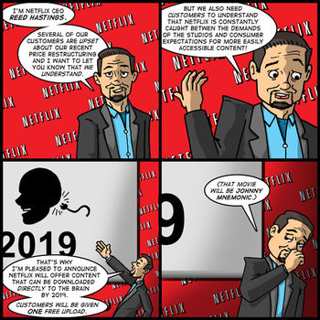 As for today’s comic, lots of people were steamed about Netflix’s price increase last week. I was actually sent more than one e-mail asking me to sign a petition against the company or to add my name to the disgruntled customers who are walking out on them.
